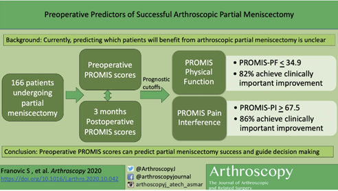 Kuhlmann N, Franovic S, Moutzouros V, Makhni E. Role of pre-operative PROMIS scores in predicting post-operative outcomes and likelihood of achieving MCID following arthroscopic meniscus surgery. Orthopaedic Journal of Sports Medicine. July 2020. doi:10.1177/2325967120S00491