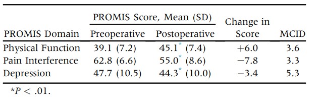 Lastly, our patients experienced, on average, a 3.4-point decrease in depression. Because of the improvements in pain and physical function, our patients experienced an overall increase in their mood and quality of life