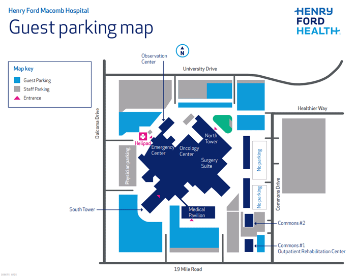 All self-parking at Henry Ford Macomb Hospital is free. Self-parking areas are available near the north and south entrances, Medical Pavilion and Emergency Department, with designated accessible parking spaces in all areas and wheelchairs available at all entrances. Designated spots for Surgical and Cancer Center patients are located near the north entrance.