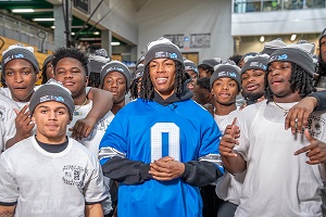 Detroit, Mich. – Detroit Lions superstar Jahmyr Gibbs hit the Detroit Riverwalk alongside Henry Ford Health team members to reward Detroiters for “random acts of health” in a new series of videos debuting today on the health system’s social media channels. From the Riverwalk, Gibbs hopped in a van emblazoned with his face to surprise the Cass Tech High School football team during their playoff run.